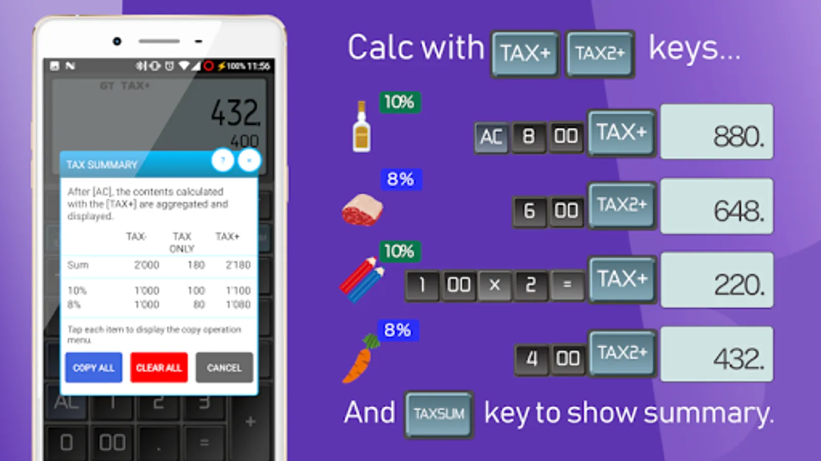 Consumption tax can be calculated and excluded. Two tax rates can be set freely, and the tax amount is also displayed.