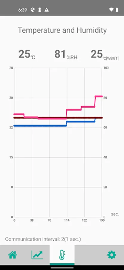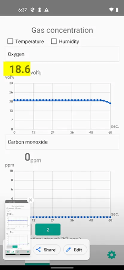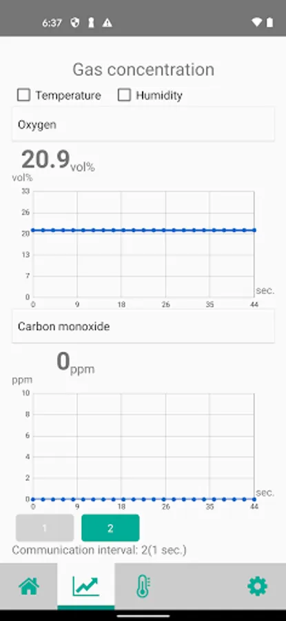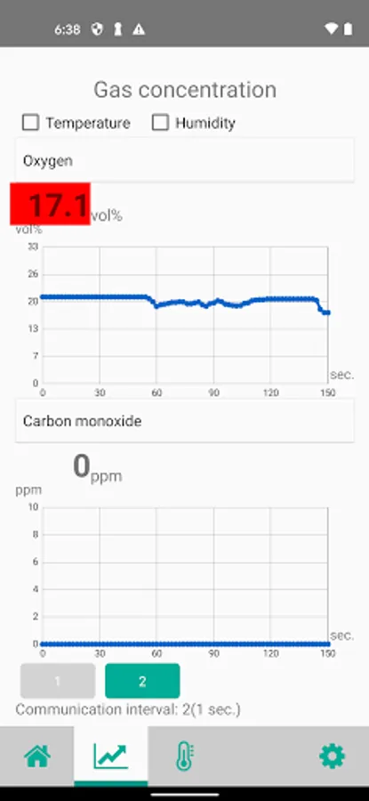 You can display real-time gas concentrations sent from a gas detector in graph form. The temperature and humidity can be displayed in graph form, too.