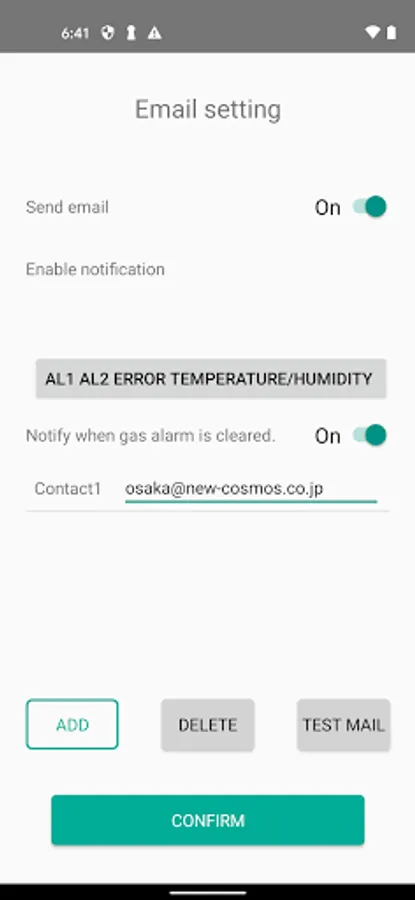 In addition, this app enables an alert email to be sent when a device fault with the gas detector occurs. This function is to notify the user that the gas monitoring is not normal.