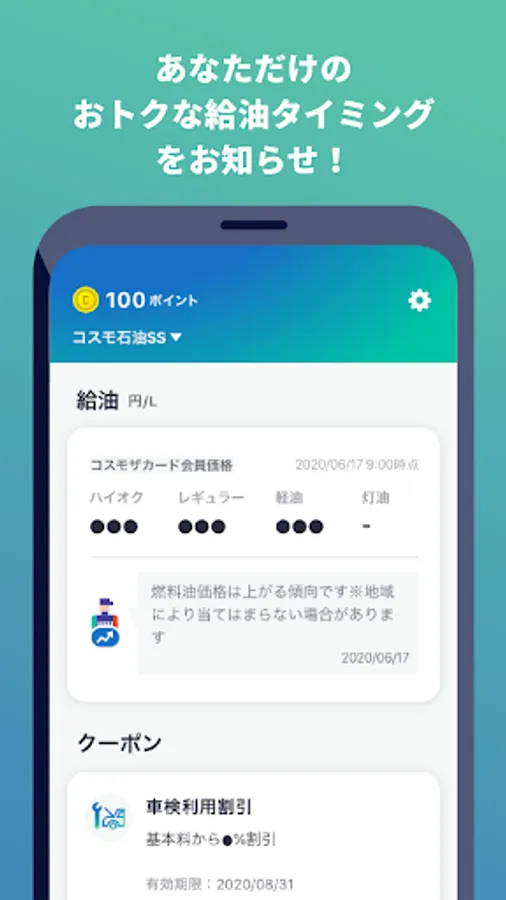 It is an application that you can save gasoline at Cosmo Station just by putting it in! The app completes the process from estimation to payment with a scrutineering! In addition, you will receive a special discount coupon limited to the app.