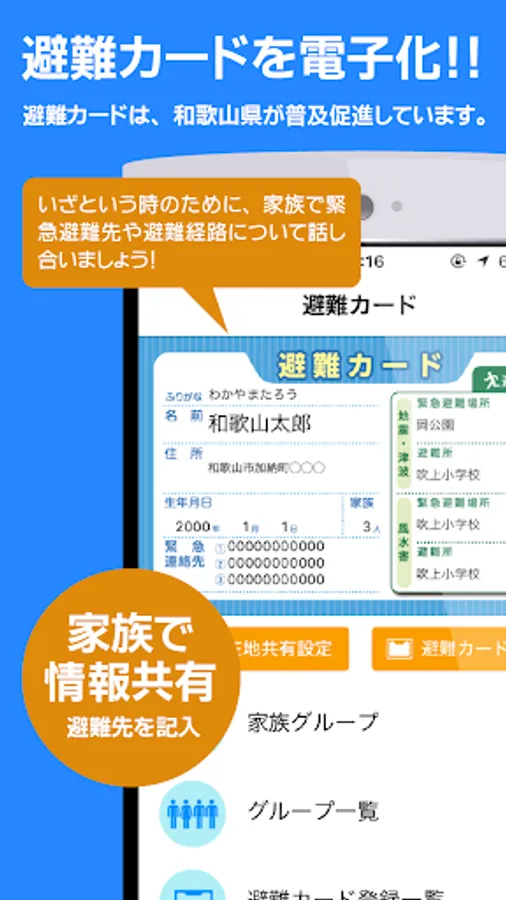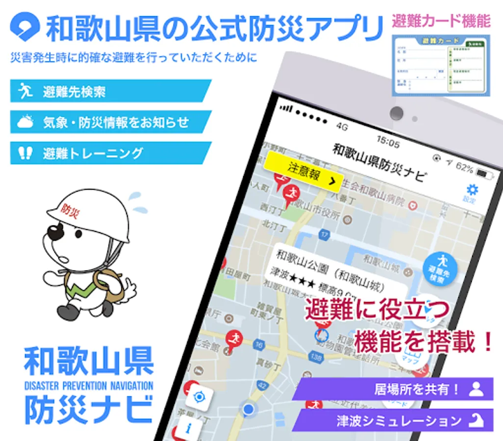 防災ナビには避難に役立つ様々な機能を搭載しています。避難先検索の他、家族の居場所確認や避難トレーニングなどもできますので、ぜひご活用ください。