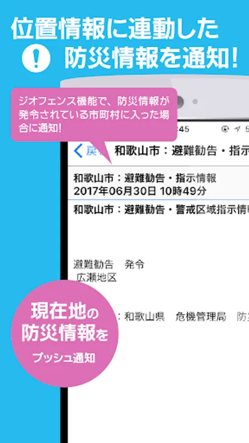 ・事前の登録なしで、気象警報・注意報や避難勧告等の防災情報がプッシュ型で届く。