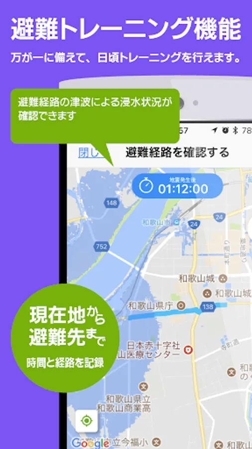 ・避難場所の安全レベルも確認でき、最短ルートを地図上に表示。