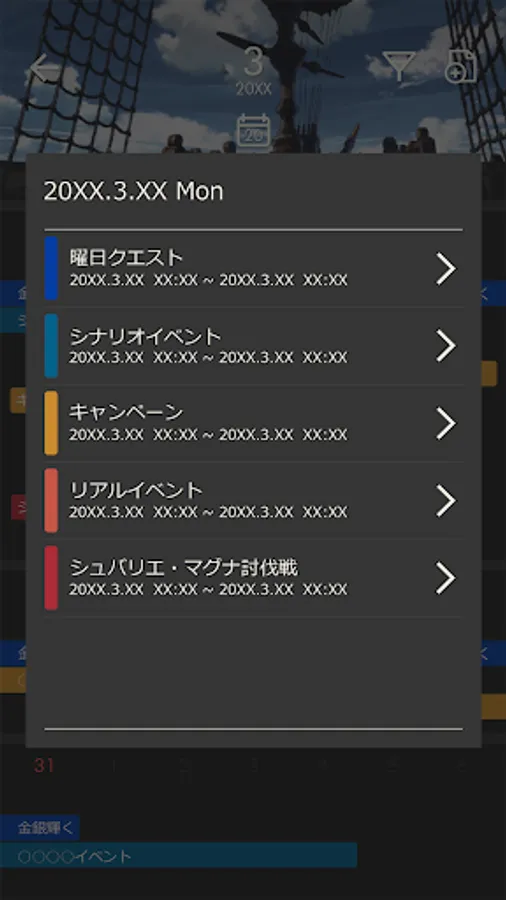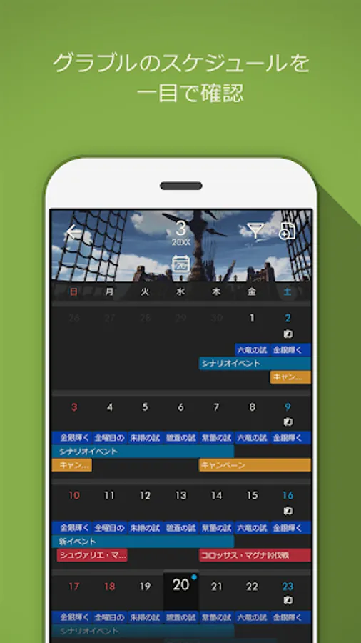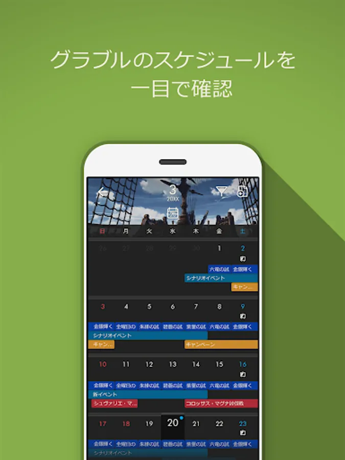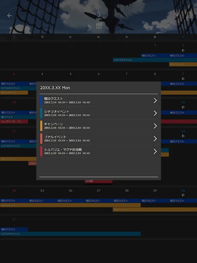 - Check the battle and events schedule in the calendar. Firmly check events and treasure you do not want to miss!