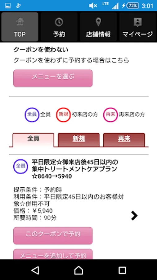 Discount coupons are delivered. Because it can also be reserved in coupon use at the time of net book is also the time of coming to the store you can massage smoothly.