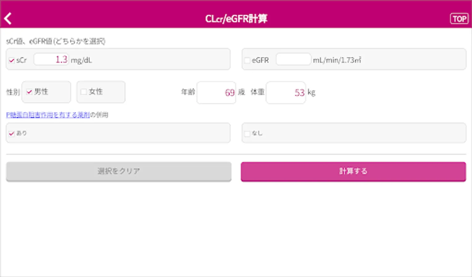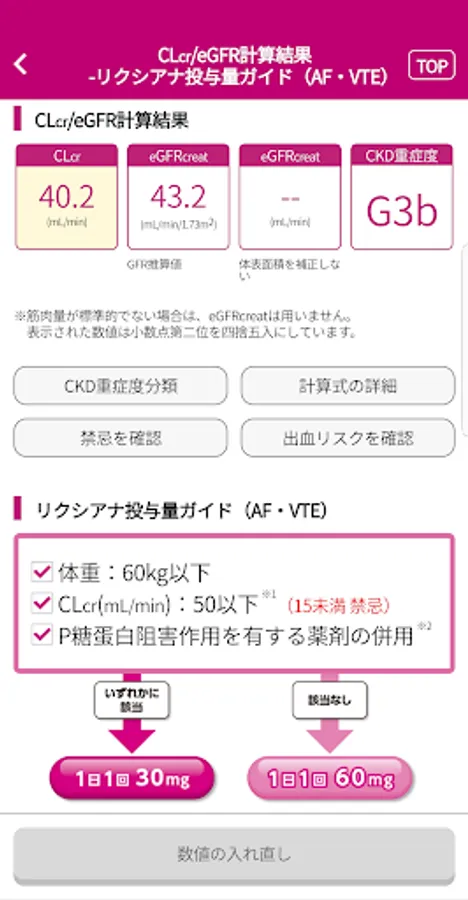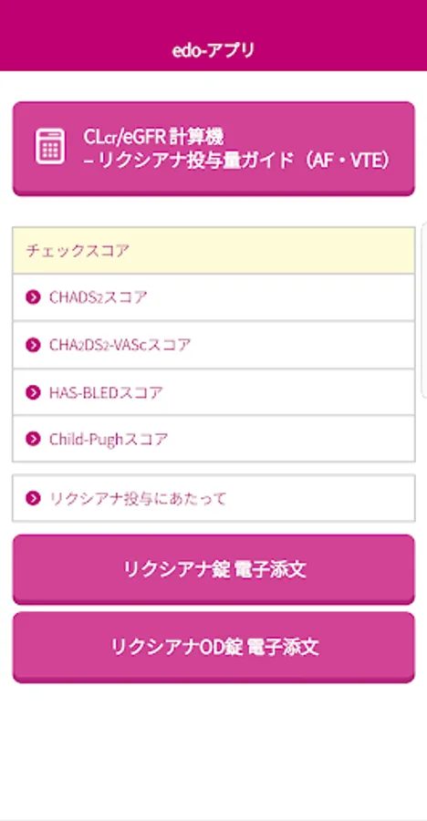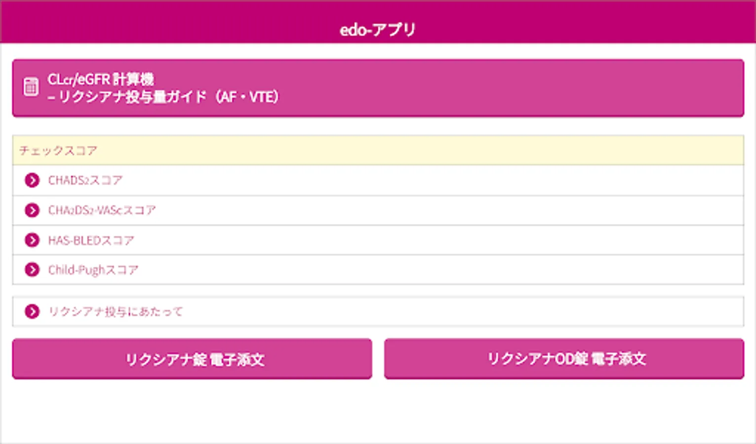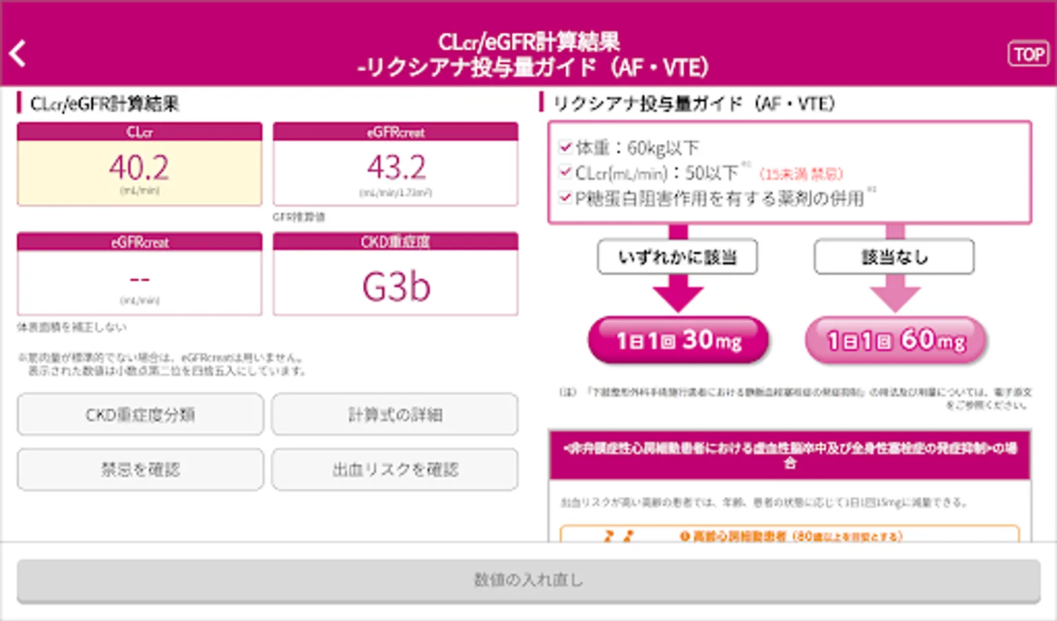 Creatinine clearance can be calculated from serum creatinine or eGFR, and a dose guide for Lixiana Tablets (edoxaban) is displayed. In addition, calculation of scores related to treatment such as CHADS2, CHA2DS2-VASC, HAS-BLED, Child-Pugh, etc. is possible.