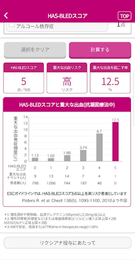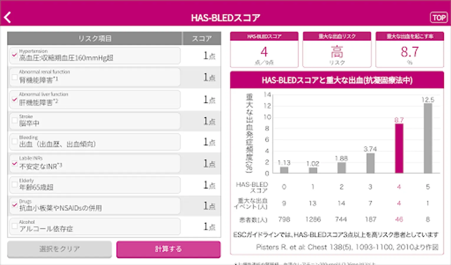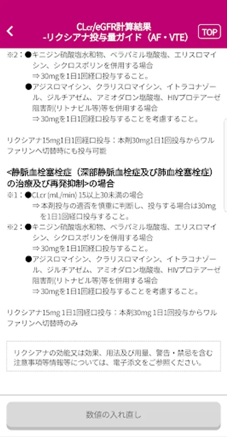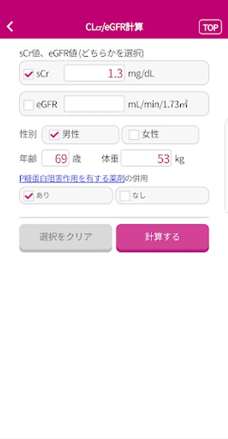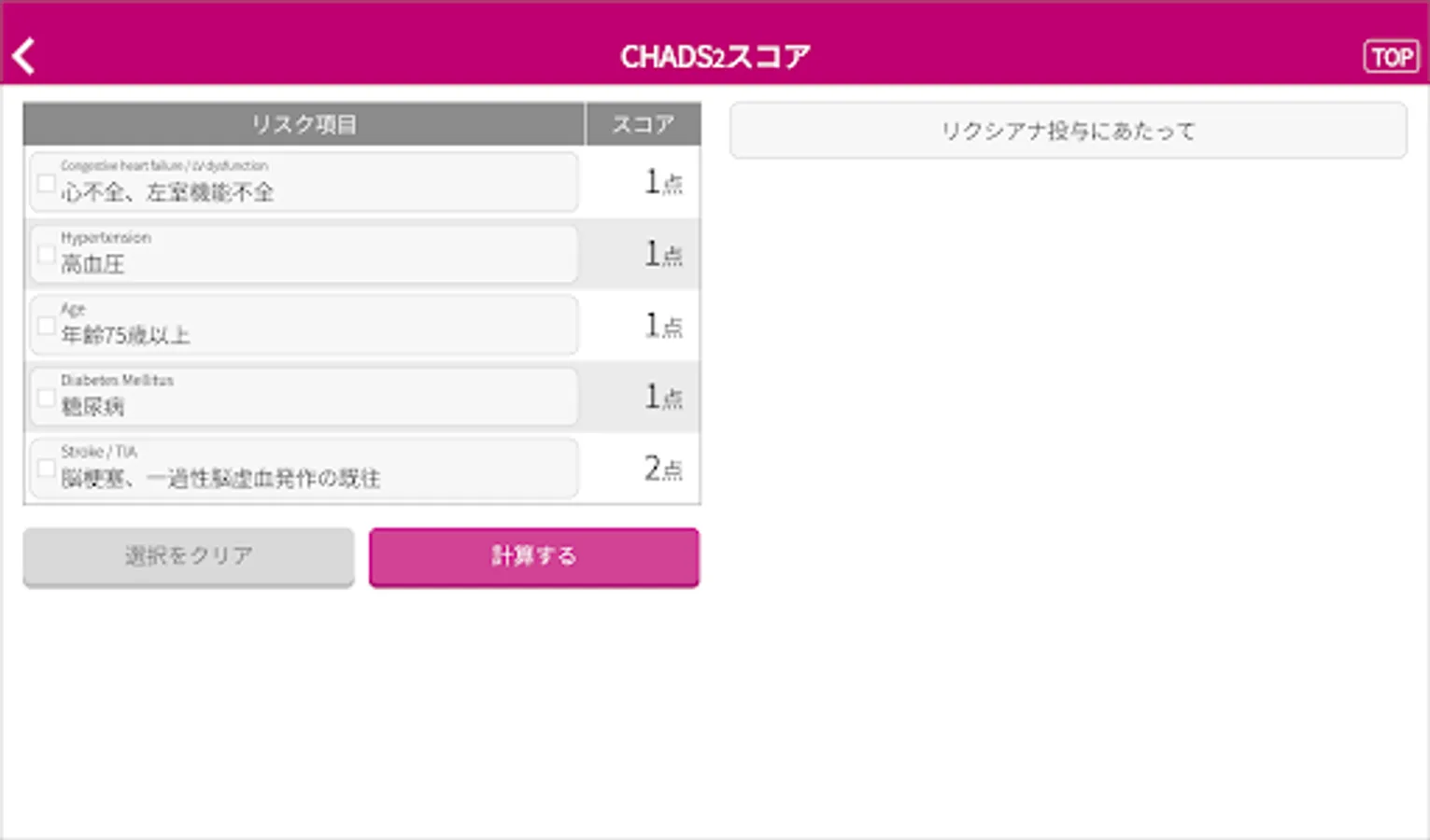 Creatinine clearance can be calculated from serum creatinine or eGFR, and a dose guide for Lixiana Tablets (edoxaban) is displayed. In addition, calculation of scores related to treatment such as CHADS2, CHA2DS2-VASC, HAS-BLED, Child-Pugh, etc. is possible.