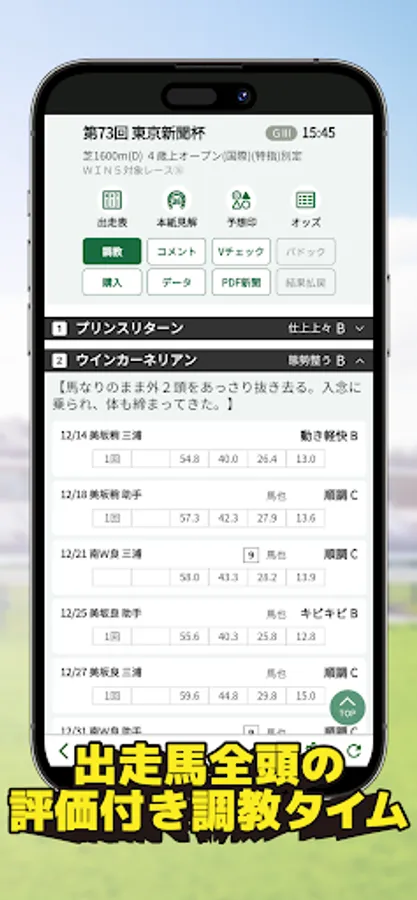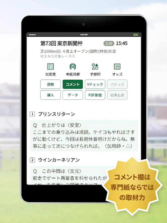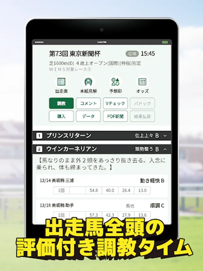 ・全レースの出走表、調教タイム、厩舎コメント、オッズ、スピード指数
