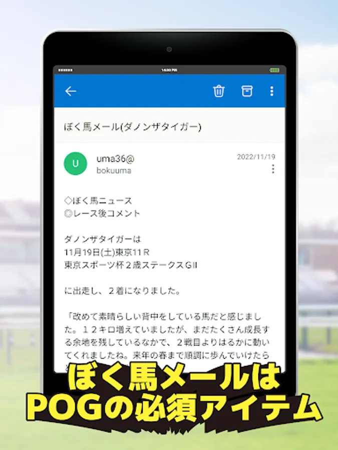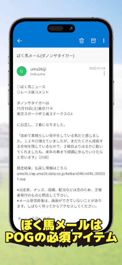 ・ぼく馬メール…特別登録、追い切り、出走想定、出走&馬番確定、入退厩、次走報など取材情報、レース成績、レース後コメントなど愛馬の情報をメールで随時お届け!