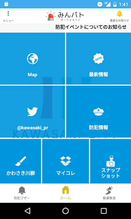 かわさき防犯アプリ「みんパト」は、市域の犯罪情報をいち早くプッシュ通知でお届け。犯罪や事件に巻き込まれるのを防ぐお守りのように使える防犯アプリです。