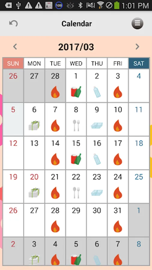1. Neighborhood Garbage Collection Calendar Displays the collection days for burnable garbage, non-burnable garbage, and recyclable garbage