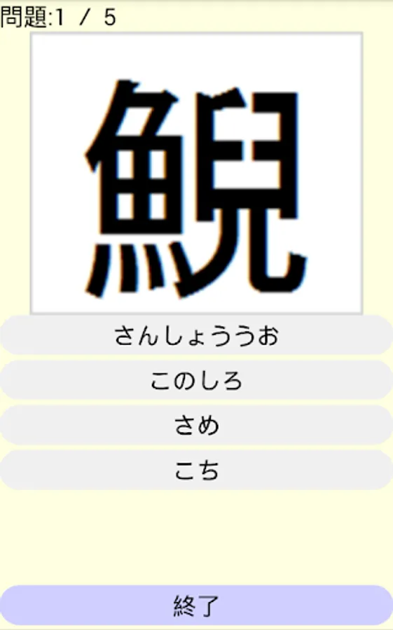 Select from 4 choices for the reading of the kanji for the displayed fish.