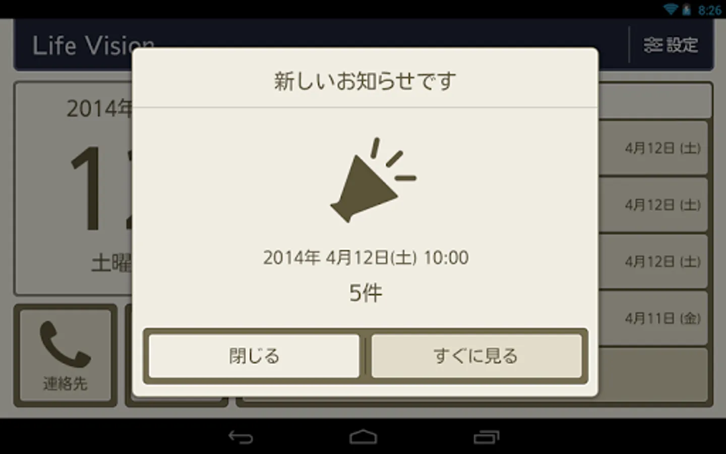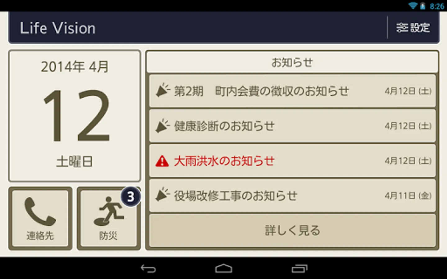 Life Vision is a communication app that uses tablet devices to connect towns and people, and people to people. In municipalities and villages, it can be used as a means of communication that connects government offices and households. Municipalities will be able to send "notices" and "neighborhood association notifications" with clear sound quality, large letters and images, and townspeople will be able to "attend/absent to events" and "reserve facility services" with simple operations. increase. It is possible to flexibly customize functions to meet the needs of local governments, and to revitalize the region with a variety of communication.