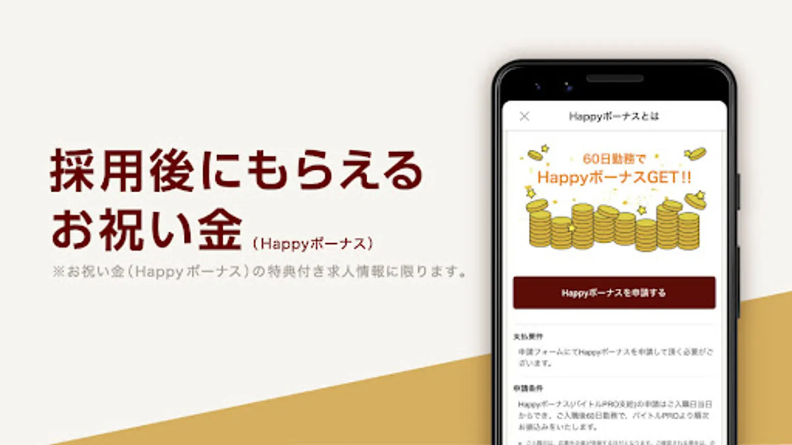 If you apply for job information through Baitoru PRO and apply after hiring, you will receive a Happy Bonus as a employment preparation.