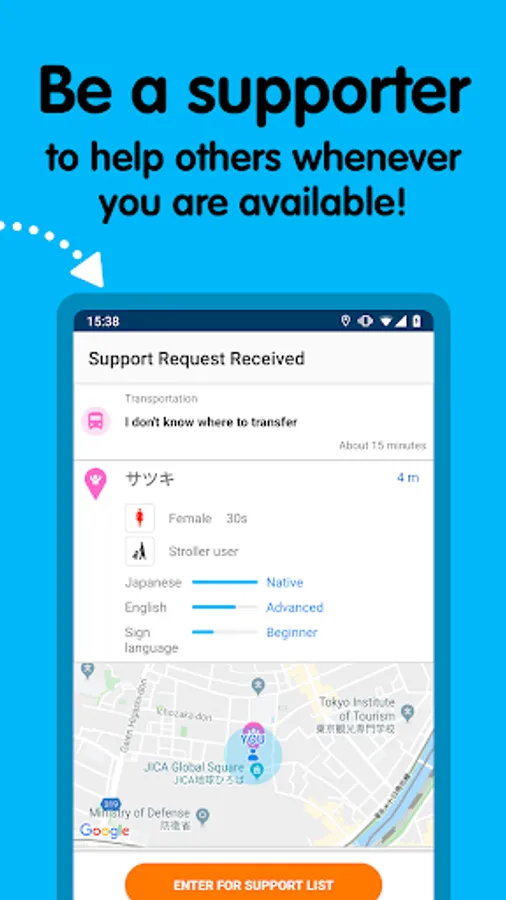 ・Please note that this app will not guarantee 100% match. If you can find the supporter depends on the situation at the moment.