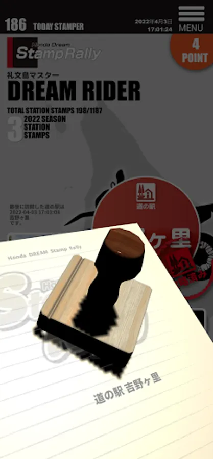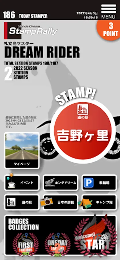 After downloading, those who participate in the stamp rally can enter for free with the card number of Honda Dream Owner's Card * (or Road Service Mini). When the terminal is activated and you start the app at the "Roadside Station" or "Scenic Point" that you stopped by while touring, you can stamp it.