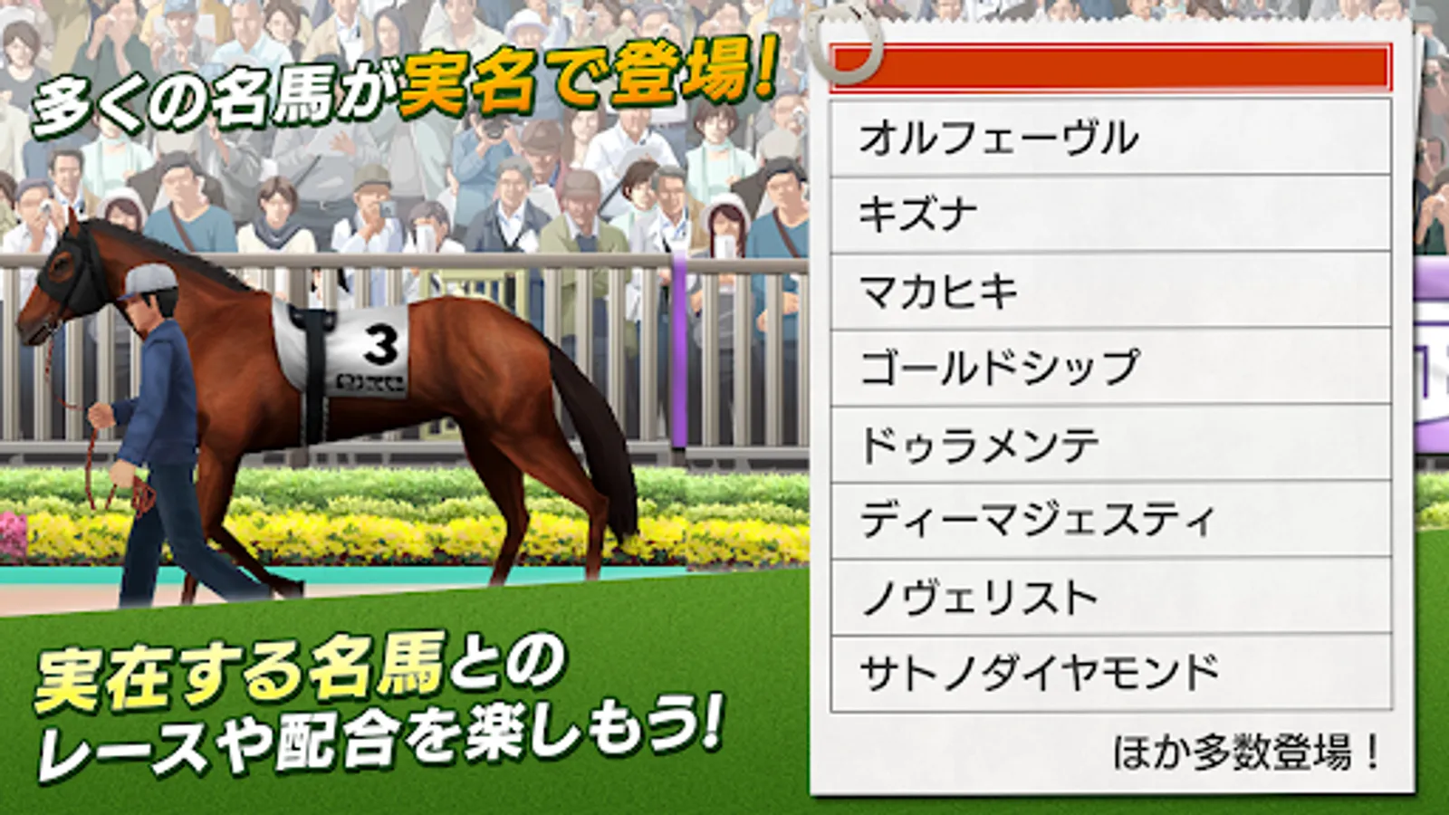 Feel free to play network multiplayer against nearby friends and distant rivals at the Breeders' Cup! Raise the strongest horses and challenge the top of breeders nationwide!