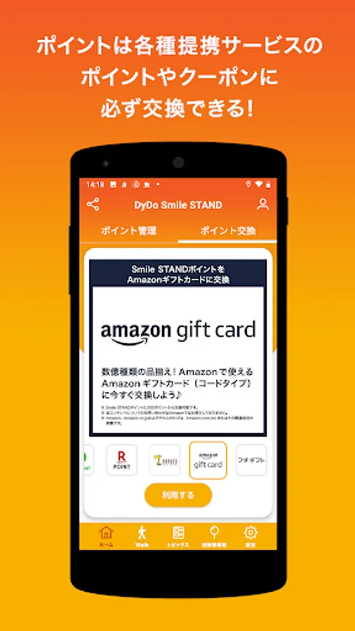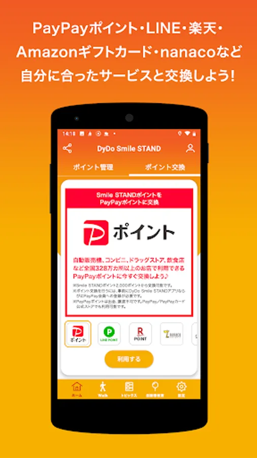 Using the "DyDo Smile STAND App" is easy. After downloading the app, purchase products from a Smile STAND-compatible vending machine, hold your smartphone over the vending machine, and tap the "Collect points" button. Accumulated points can be exchanged for various content such as "PayPay points", "Rakuten points", and "Amazon gift cards".