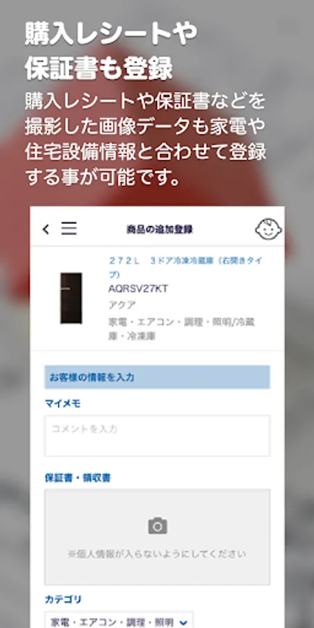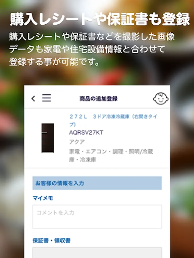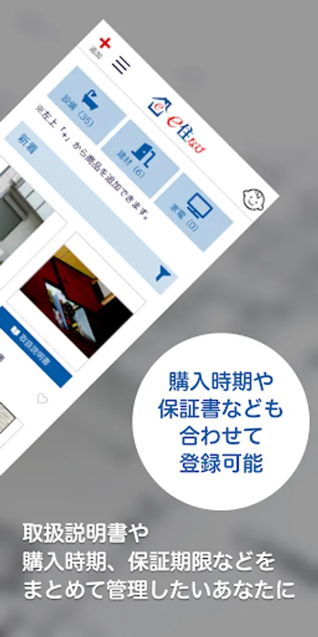 It is possible to register image data such as "purchase receipt" and "warranty card" together with home appliances and housing equipment information.