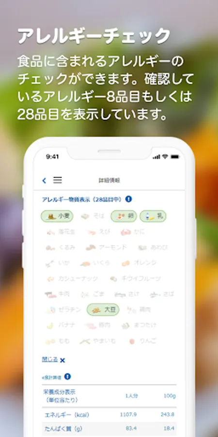 You can check for allergies contained in food. 7 or 28 confirmed allergens are displayed.