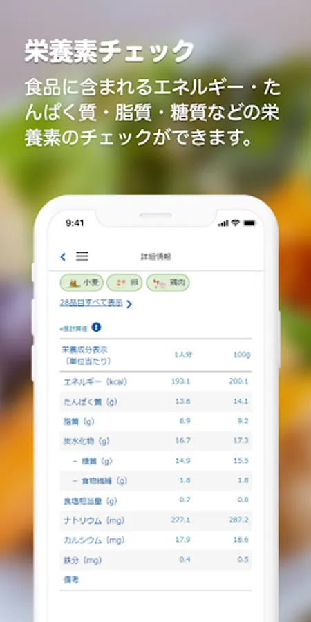 You can check nutrients such as energy, protein, lipid, and sugar contained in food. You can check not only the value displayed on the packaging material, but also the nutritional value per 100g and per product.