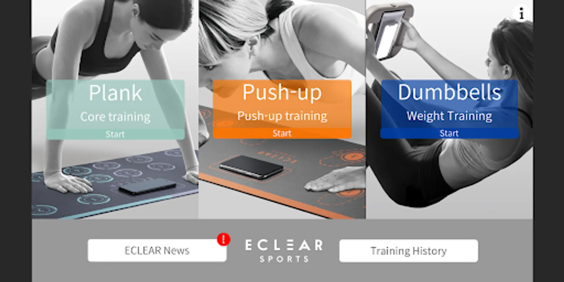 A dedicated application for the ECLEAR SPORTS training dumbbells/plank training mat/push-up training mat series of physical training programs that emphasize individual style and integration into working adult lifestyles.
