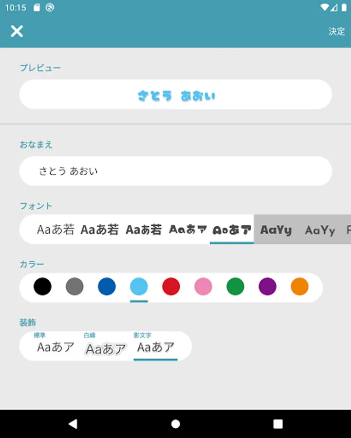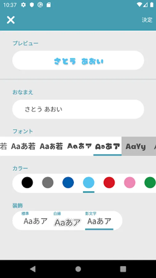 In "Name Island", you can not only select kanji, hiragana, katakana, and alphabet for the text, but you can also add borders and shades to each.
