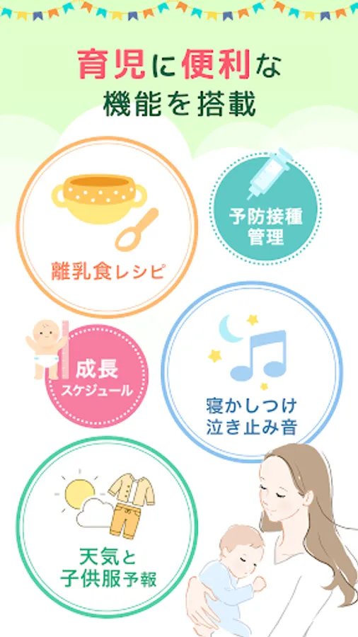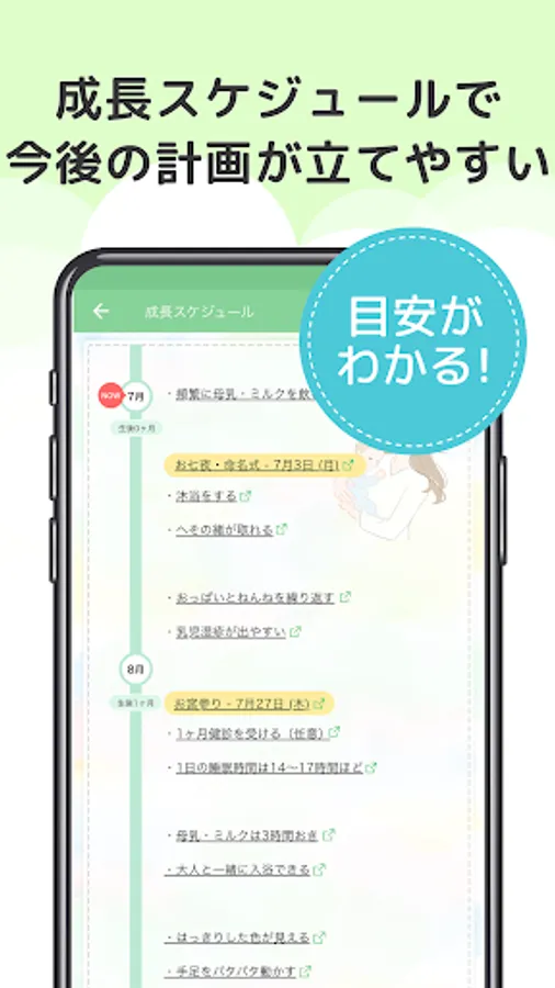 Every day until the age of 7, you will receive a message that responds to your baby's growth and current mom's worries, so you can rest assured that your first child-rearing is safe! Supports baby care