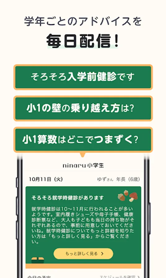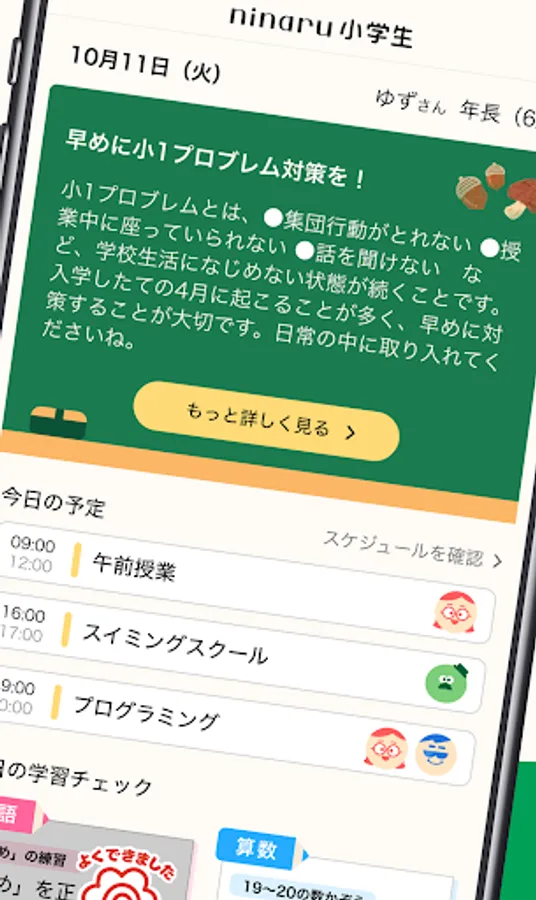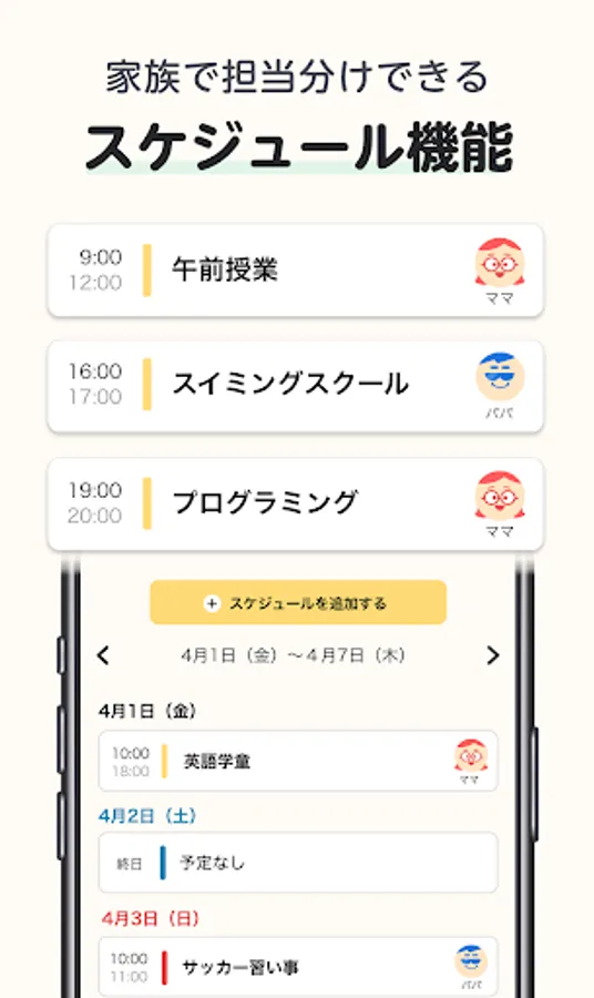 Elementary school students have a lot of plans. If you put school events such as daily pick-up and drop-off of children, lessons, and class visits in the schedule, you can check them every day from the app. If you share the app with your family, you can assign responsibility for the schedule.