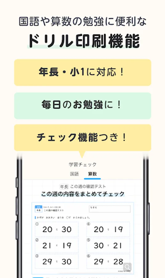 Daily delivery of Kokugo Sansu problems. You can ask your child to try it out, and if they answer, put a check mark to check their understanding of the daily study. The questions can be printed out on paper, so you can have them solve them in front of you.