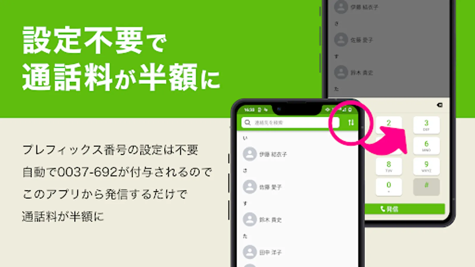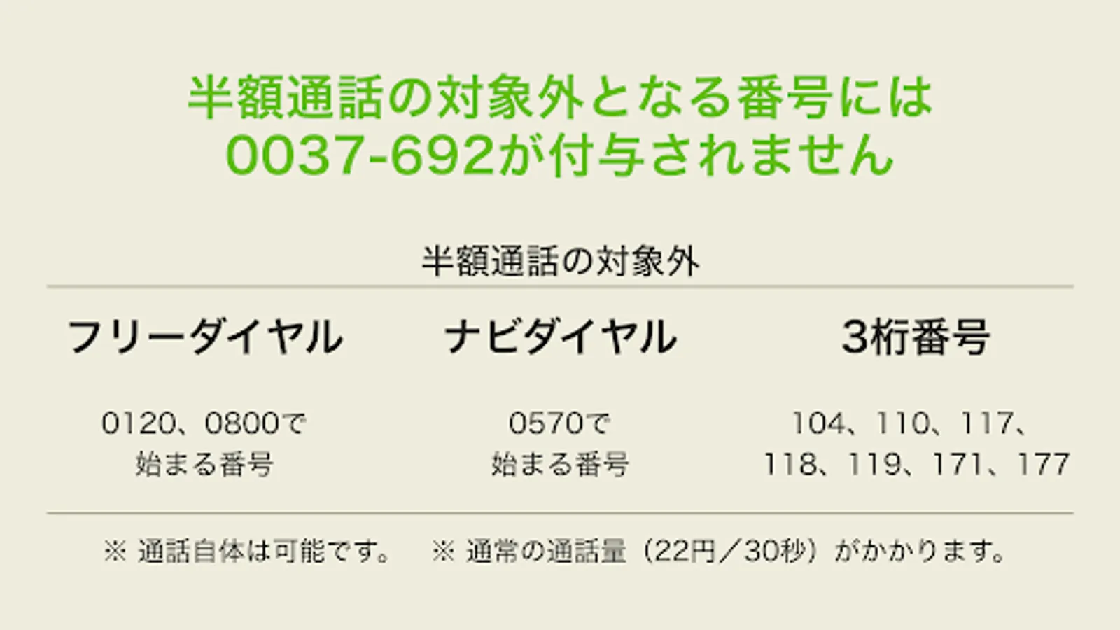 By calling from this application, a special prefix number (0037-692) is automatically assigned to the phone number, and voice calls can be used at half the call charge (11 yen / 30 seconds).