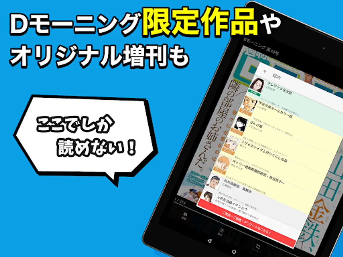 Electronic version of "Morning" full of popular serialized manga such as "Space Brothers", "GIANT KILLING", "Cooking Papa", "Forbidden Mole", and "Kousaku Shima". Original works only for D Morning are also posted!