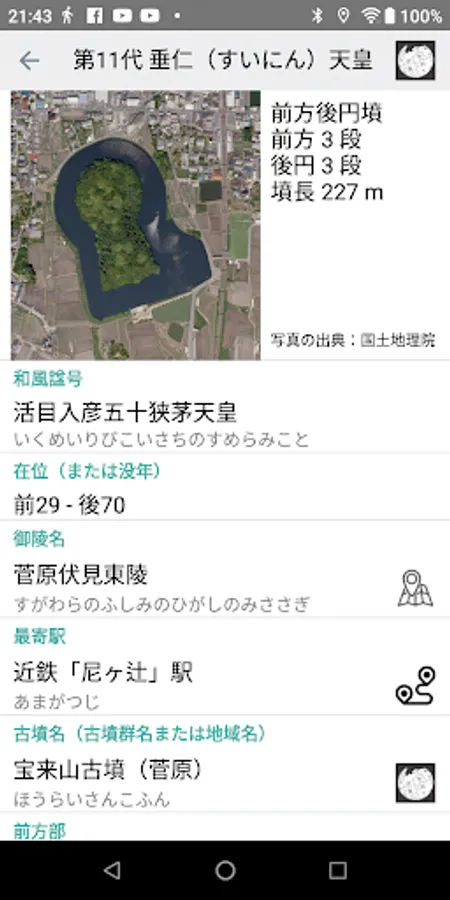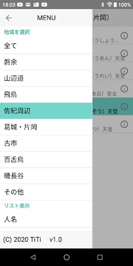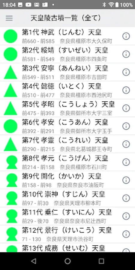Displays a list of tombs of the Emperor from the Kofun period (1st Emperor Jimmu to 42nd Emperor Monmu).