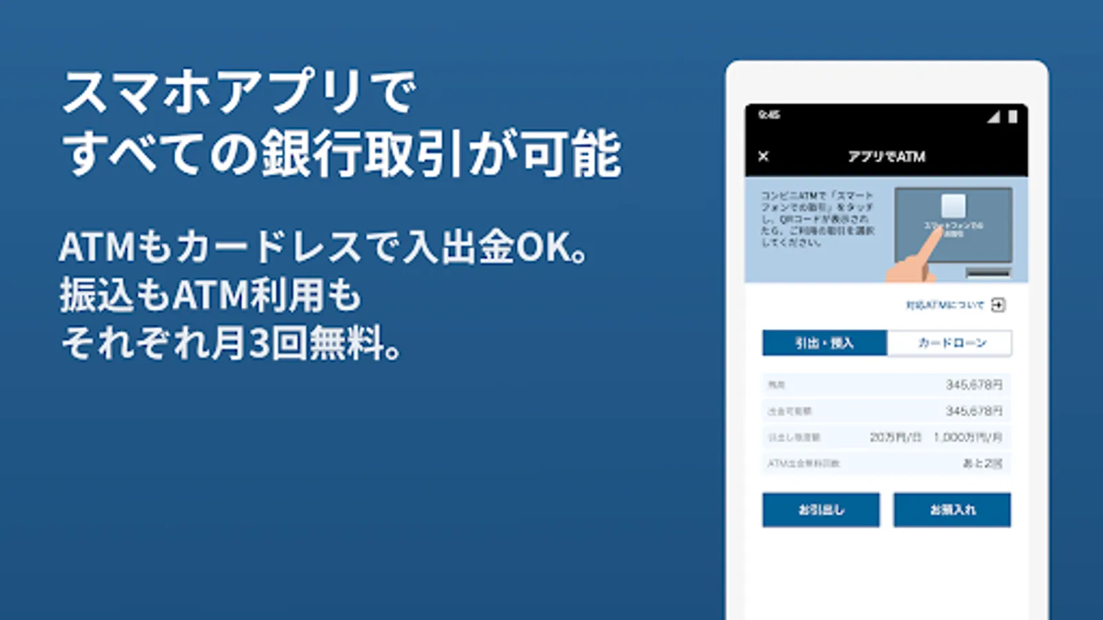 ◆ All transactions can be completed with a smartphone without the need to go to a store. Both ATM usage and transfer to other banks are free up to three times a month.
