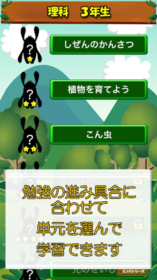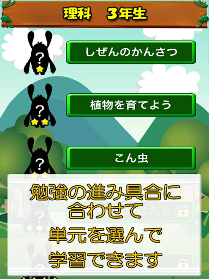 The definitive edition of the elementary school third grade science app! Select the trading unit in accordance with the progress of learning, you can efficiently review. 4 Ease of use that-option quiz format, in a fun going to collect monsters to reward the study, children will study on an ongoing basis.