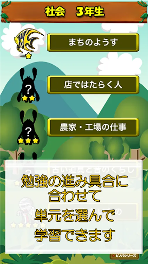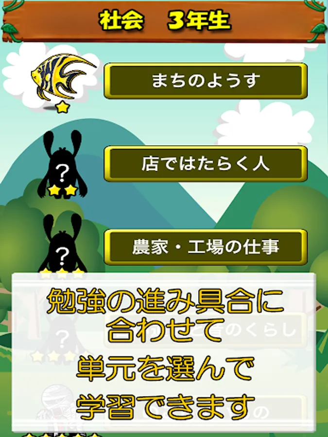 The definitive edition of the elementary school third grade social app! Select the trading unit in accordance with the progress of learning, you can efficiently review. 4 Ease of use that-option quiz format, in a fun going to collect monsters to reward the study, children will study on an ongoing basis.