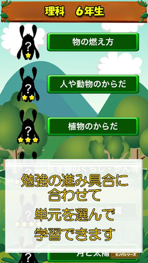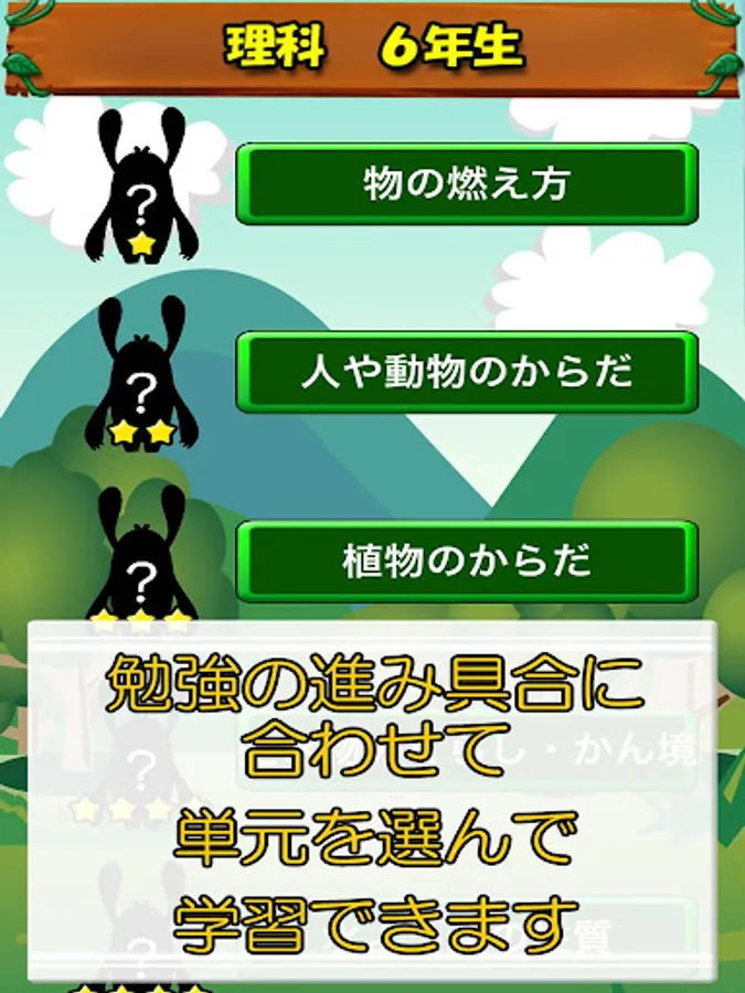 The definitive edition of the elementary school sixth grade science app! Select the trading unit in accordance with the progress of learning, you can efficiently review. 4 Ease of use that-option quiz format, in a fun going to collect monsters to reward the study, children will study on an ongoing basis.