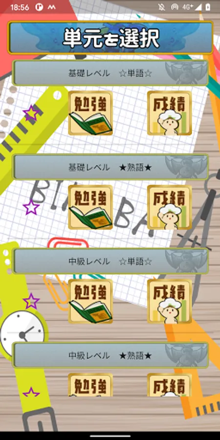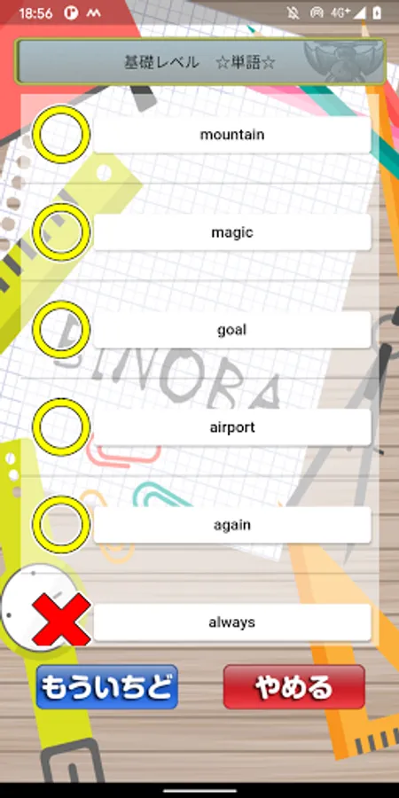 クイズ感覚で気軽に四択問題を解いたり、暗記カードのように答えを確認したりできます。