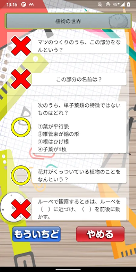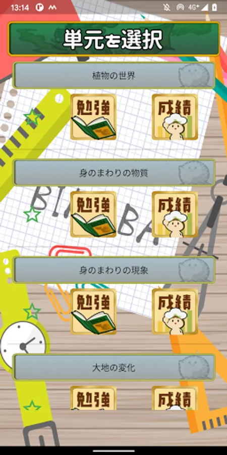クイズ感覚で気軽に四択問題を解いたり、暗記カードのように答えを確認したりできます。