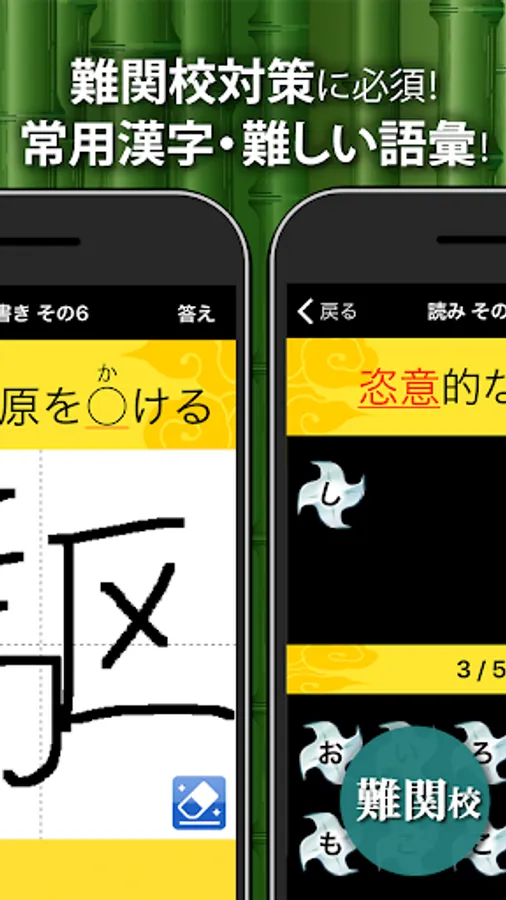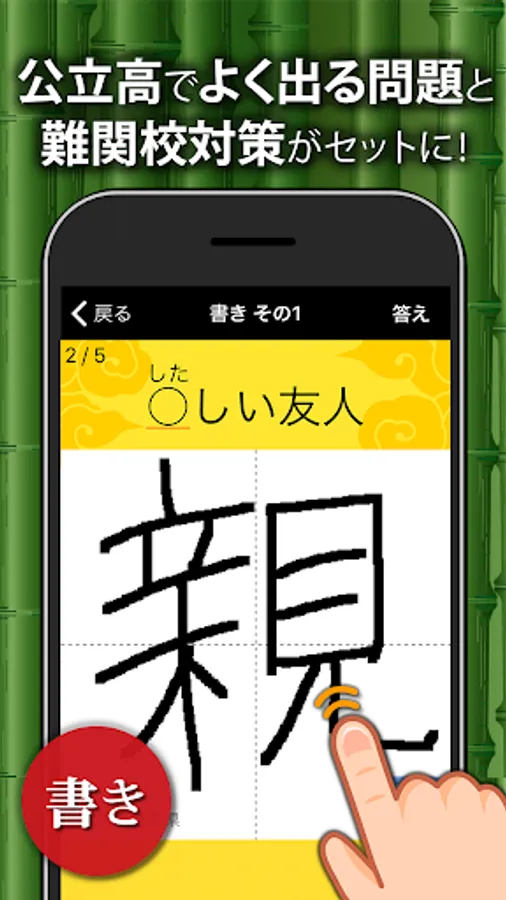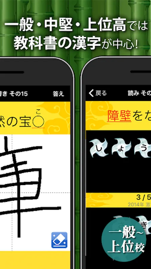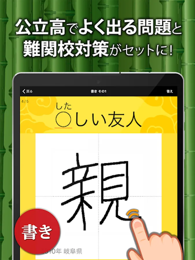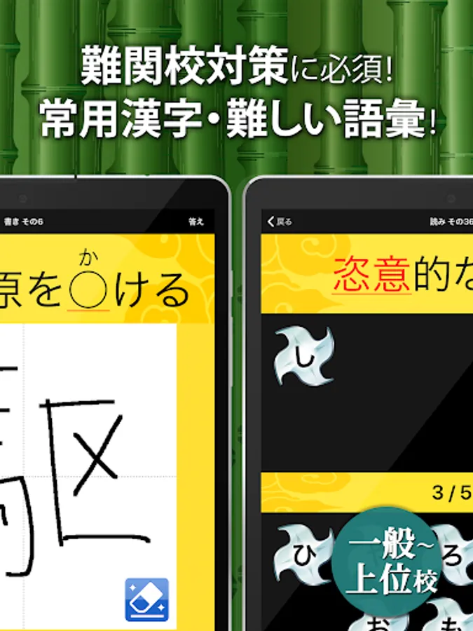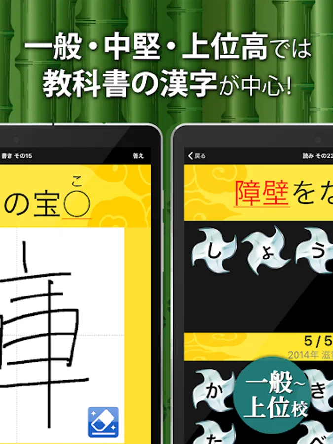 At private high schools, there may be questions about writing common kanji that are rarely learned in junior high school, so please challenge the "difficult school level" in the app.