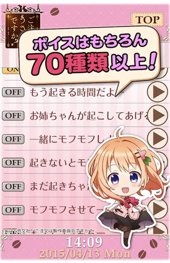 "Gochiusa alarm ~ Cocoa Hen" You can set the voice from within it is available to the alarm up to a maximum of three.
