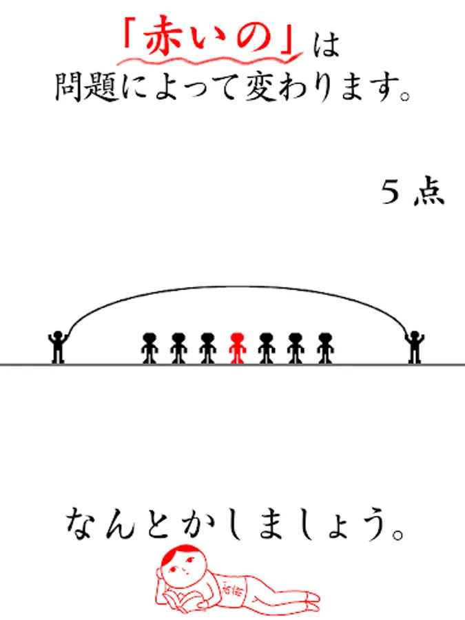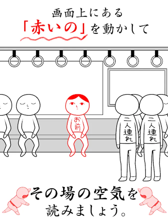 The basic rule is that you can move the red things on the screen. Mainly, you operate the main character, "you", but you may operate different things depending on the situation. By playing 100 questions, you will be evaluated how much you could read the air.
