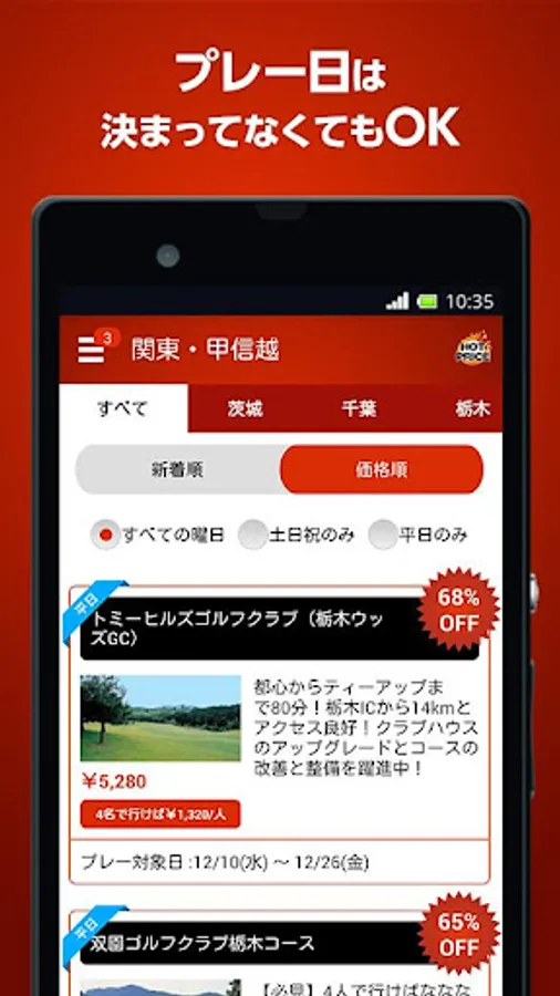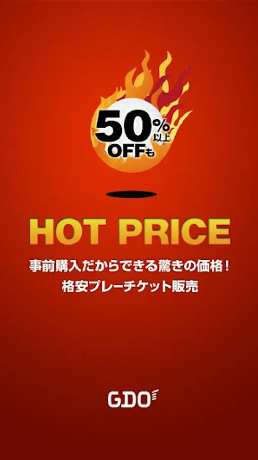 Japan's largest! HOT PRICE is an online ticket sales service provided by GDO (Golf Digest Online) that allows you to easily reserve golf courses nationwide. Loaded with great deals and limited tickets only available here! Also 50% off the regular price.