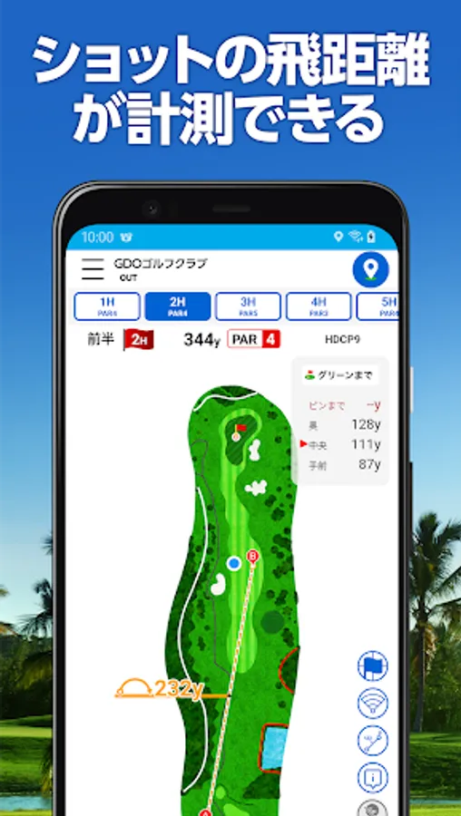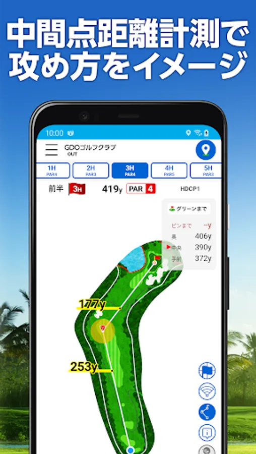 Instantly measure the distance from your current location to the green using GPS current location information. Also equipped with midpoint distance measurement. You can imagine how to attack such as avoiding hazard areas and laying up dogleg courses, which is also useful for course management.