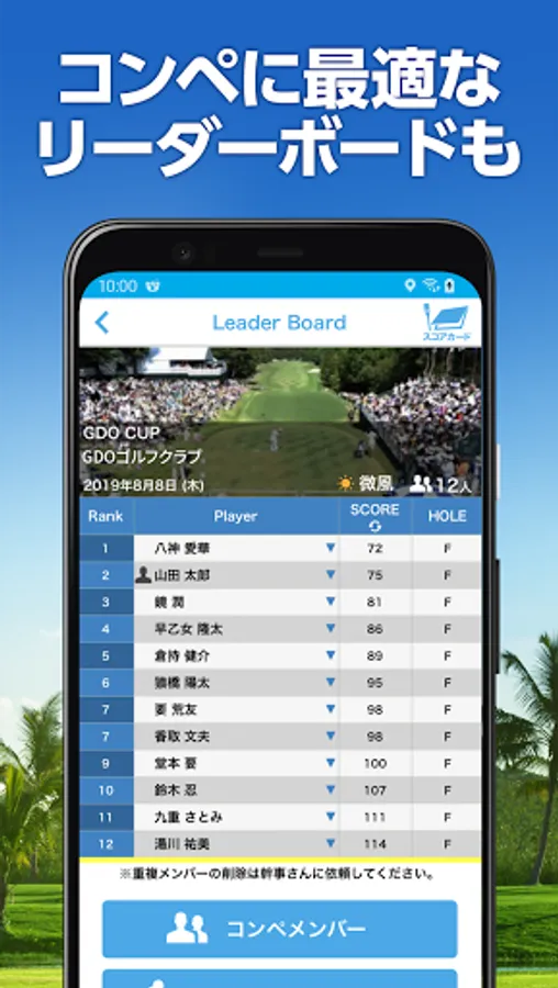 Automatically totals multiple sets of scores. Liven up with the Leader Board function! Real-time broadcast of competition member rankings during the round! It also supports the new Peria system and handicap battles.
