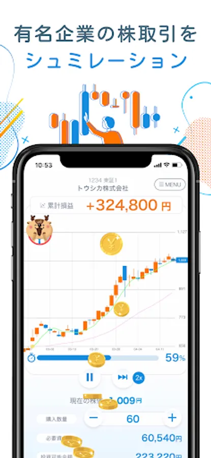 A stock simulation game where you can quickly experience and trade stock price movements on past charts that actually happened.