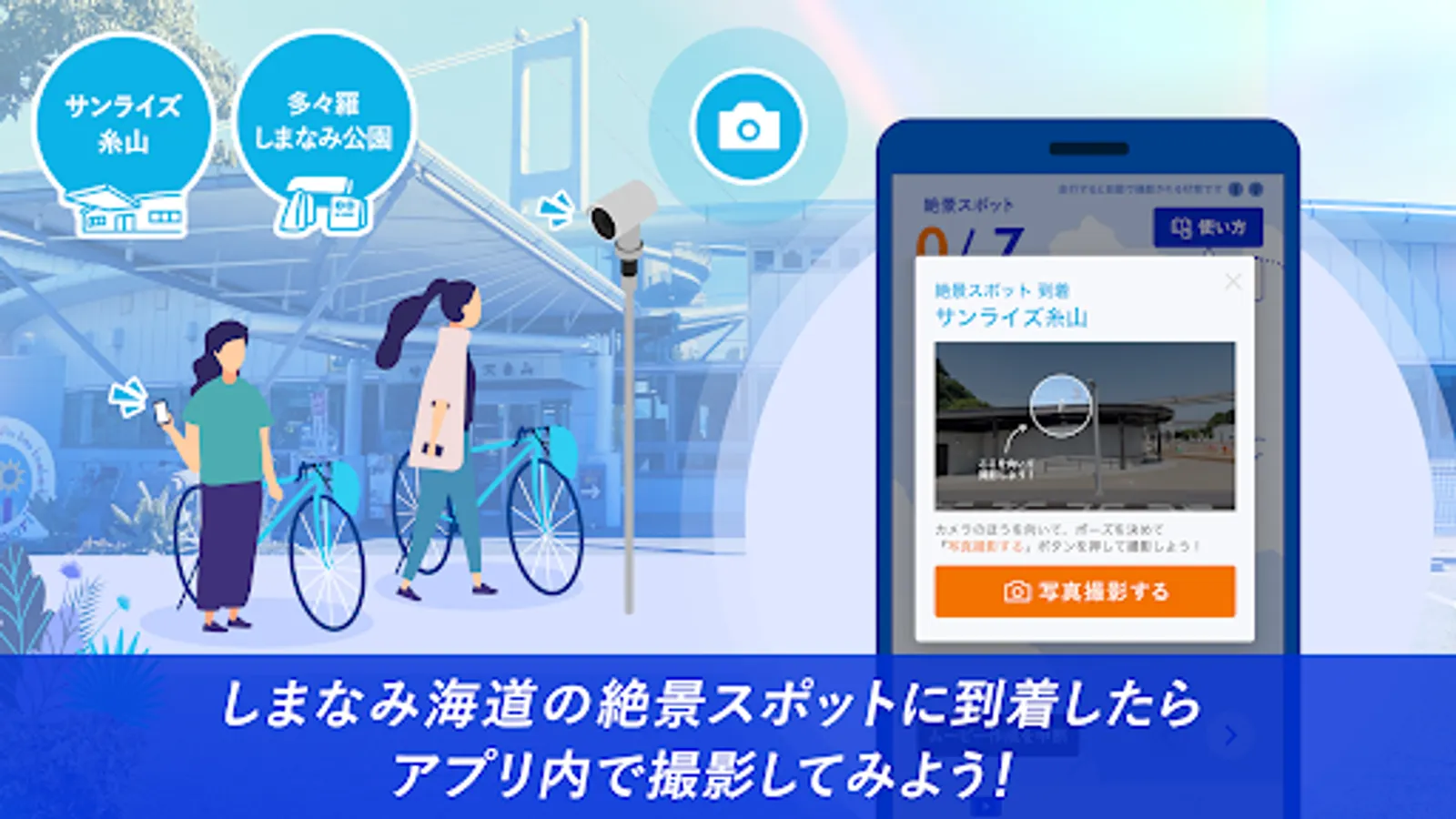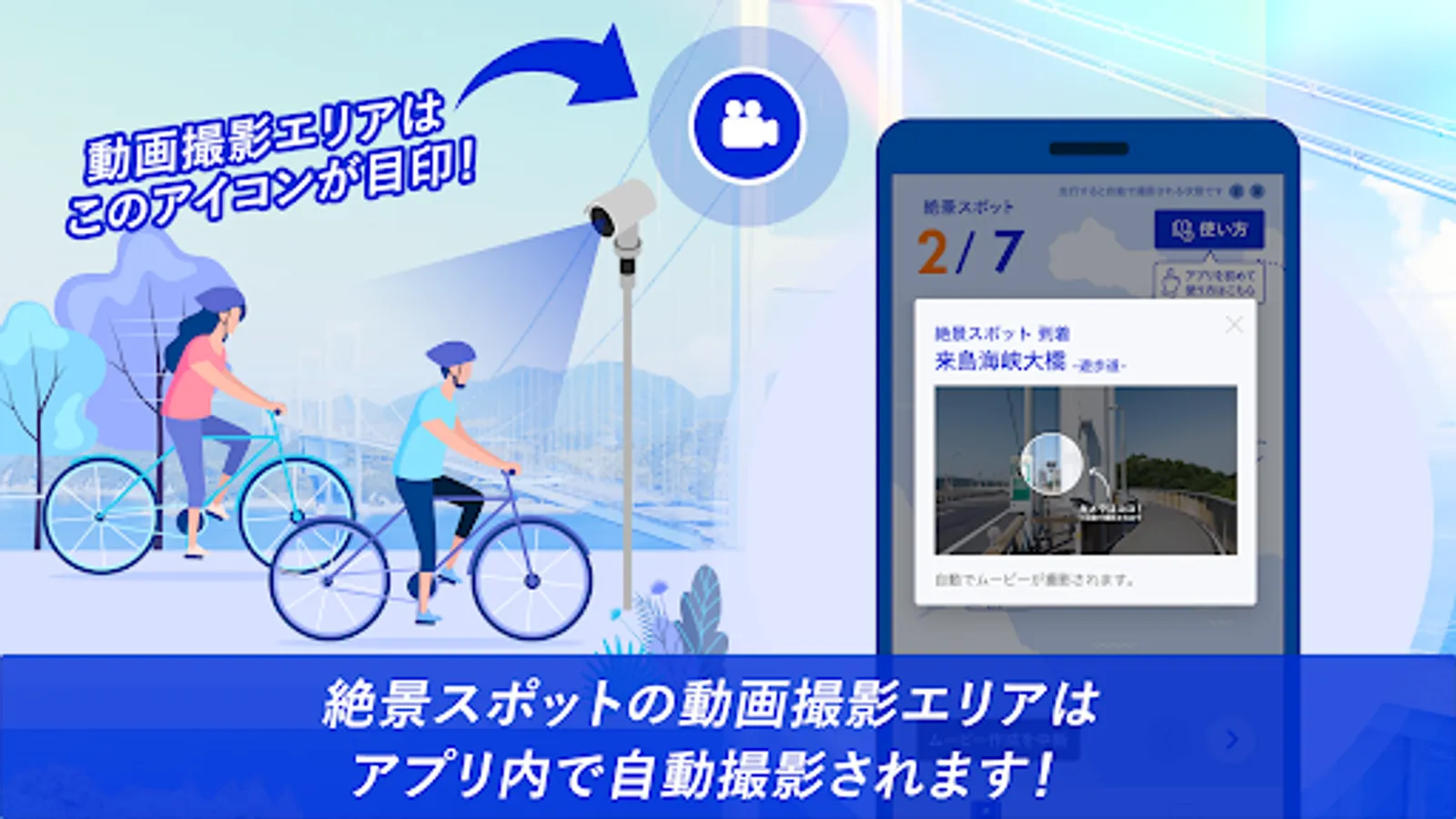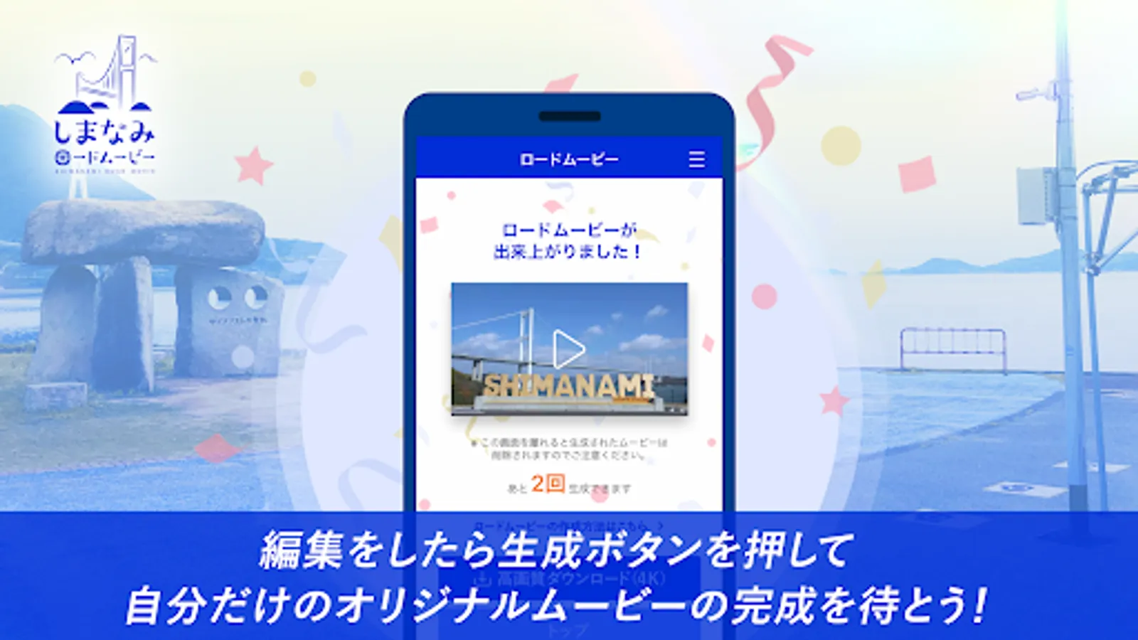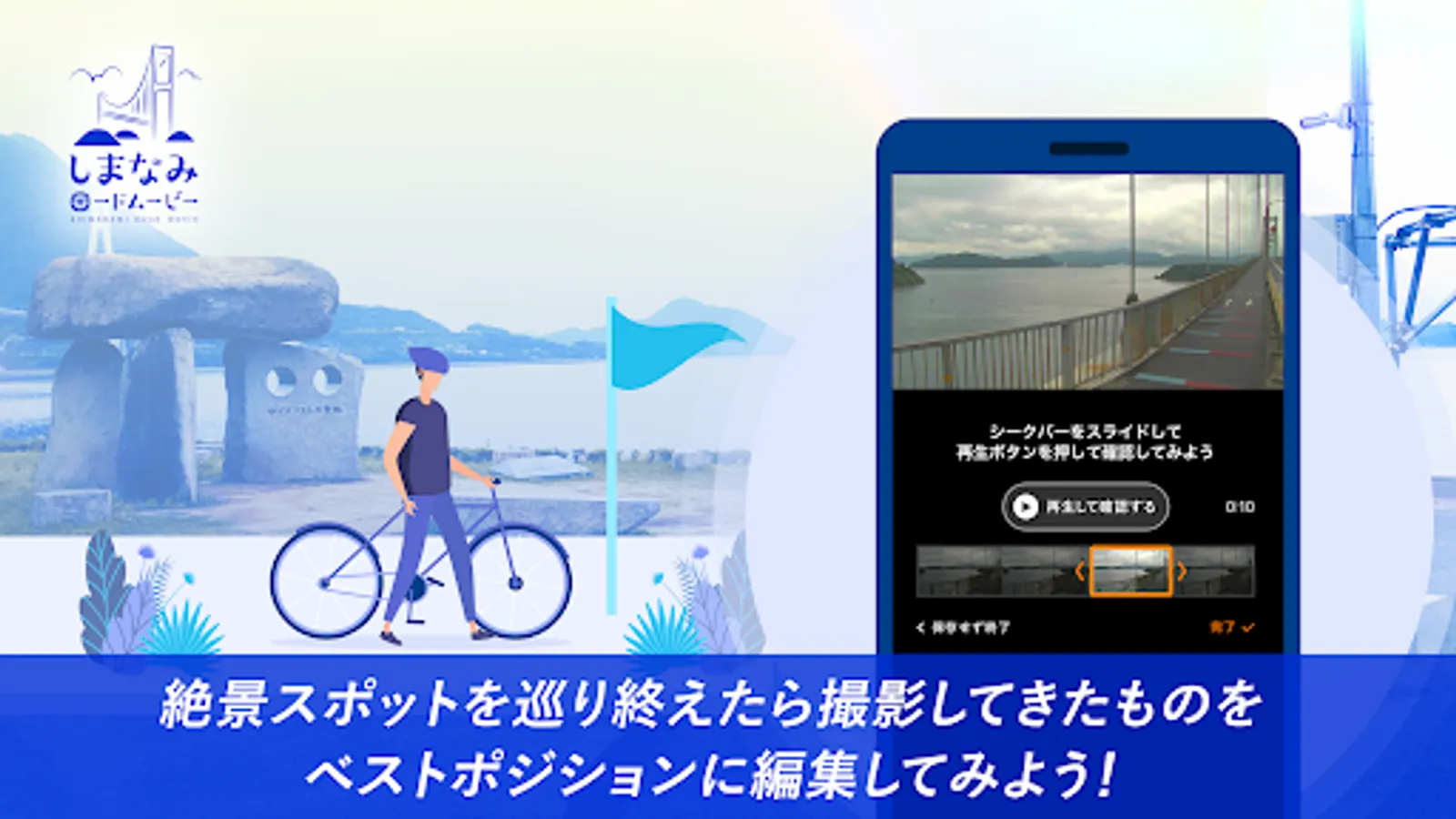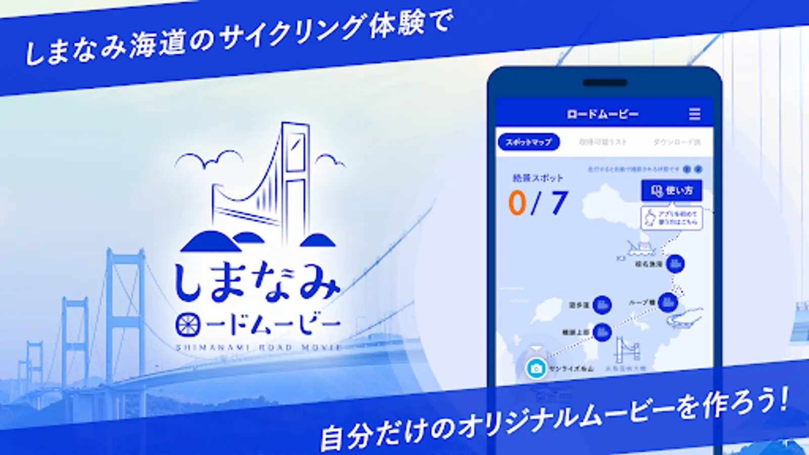 The Shimanami Road Movie App is an app that allows you to create your own original movie by connecting the photos taken on the app and the videos you ran at each spot.