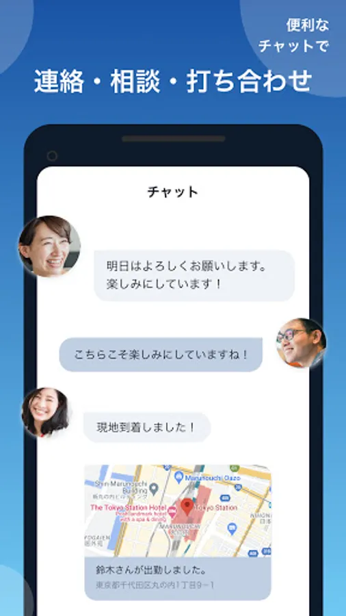It can be used as a communication tool between members who promote work without sharing a private SNS account. Great for reporting, contacting and consulting. It can also be used for attendance management with the location information function. Please use the video chat function for recruitment interviews such as reporting on-site conditions.