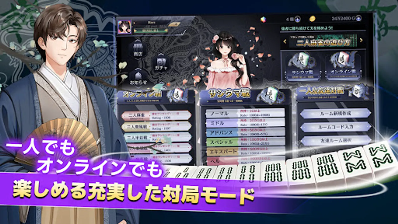 Four-person mahjong (Dongfeng/Hanso) and three-person mahjong (Dongfeng/Hanso) can be played against strong players nationwide.