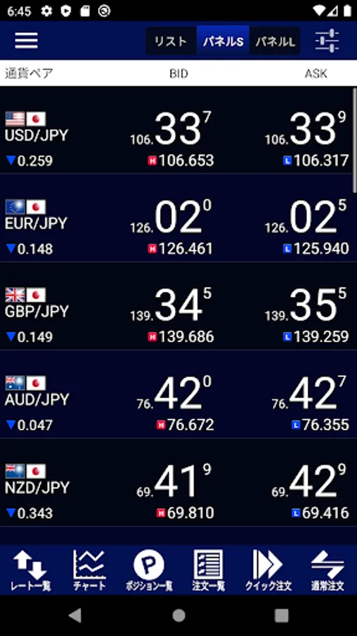 There are three types of rate display methods: List, Panel S, and Panel L. You can see the real-time rate to your liking. Of course, you can transition from the list of all rates to the "Chart Display", "Quick Order", "Order", "Payment Order", and "All Payment Orders" screens with a single tap.